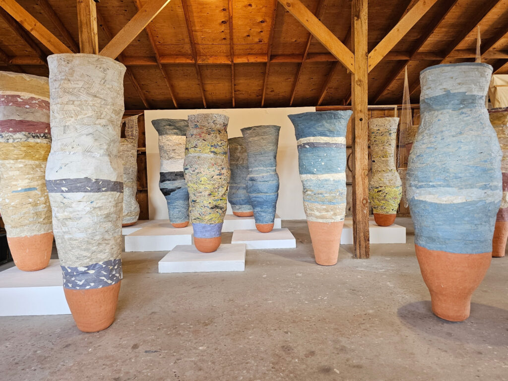 Opening at Aunt Dofe’s Gallery July 18, 2025 Rebecca Hutchinson installs the entire gallery with volumetric human-scale paper and clay vessels utilizing and remaking with Montana domestic castoffs from blue jeans, flannel shirts, to table linens.