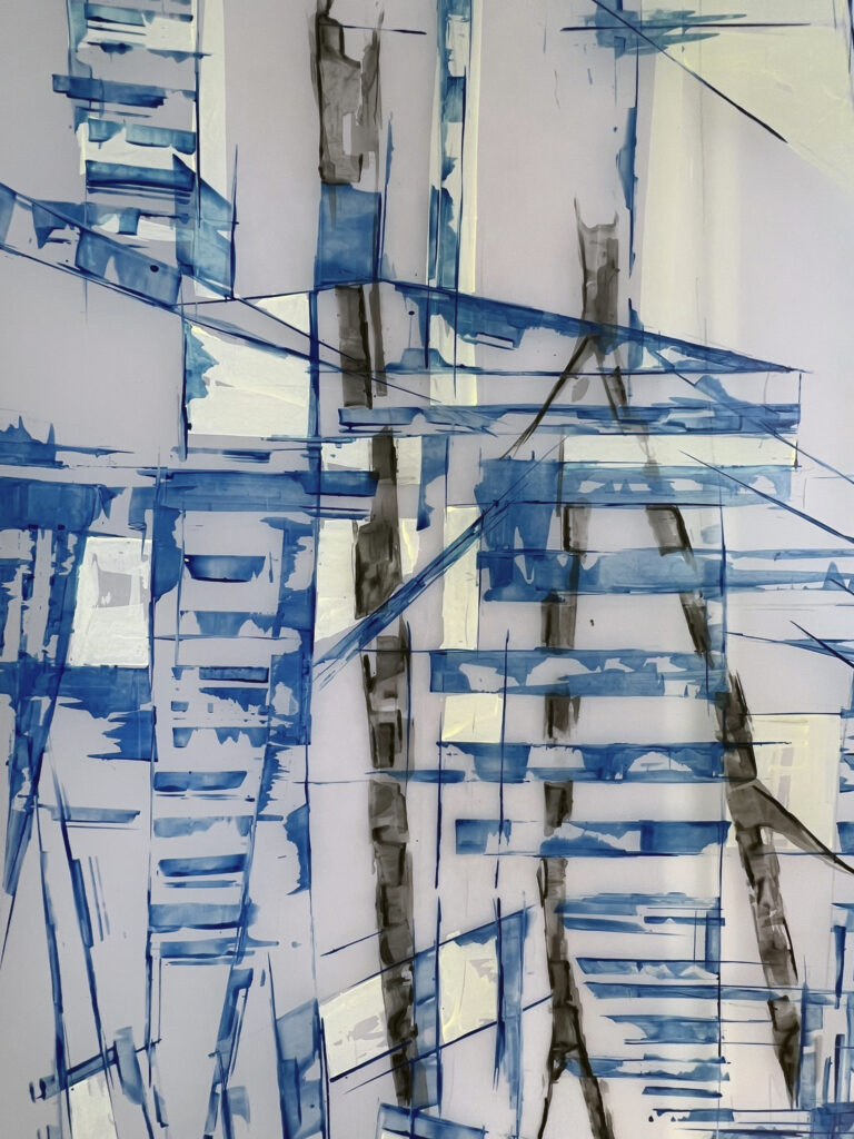 How it looks is a description of the materials, colors, texture, forms, balance, composition – the formal elements. I’ve done many colorful, figurative oil paintings and many mixed media abstractions. For the last 20+ years, my materials have mainly been Sumi ink, paper and rabbit skin glue on board. I use a brush to make black lines on various kinds of paper, soak the paper in rabbit skin glue, then put layers on board – adding brushstrokes of ink as I go. The resulting work is a bold composition of black lines on a white background, with shades of gold, brown and gray. The many layers create a rough and dense texture, with previous lines showing through the translucent paper from deep beneath the surface.